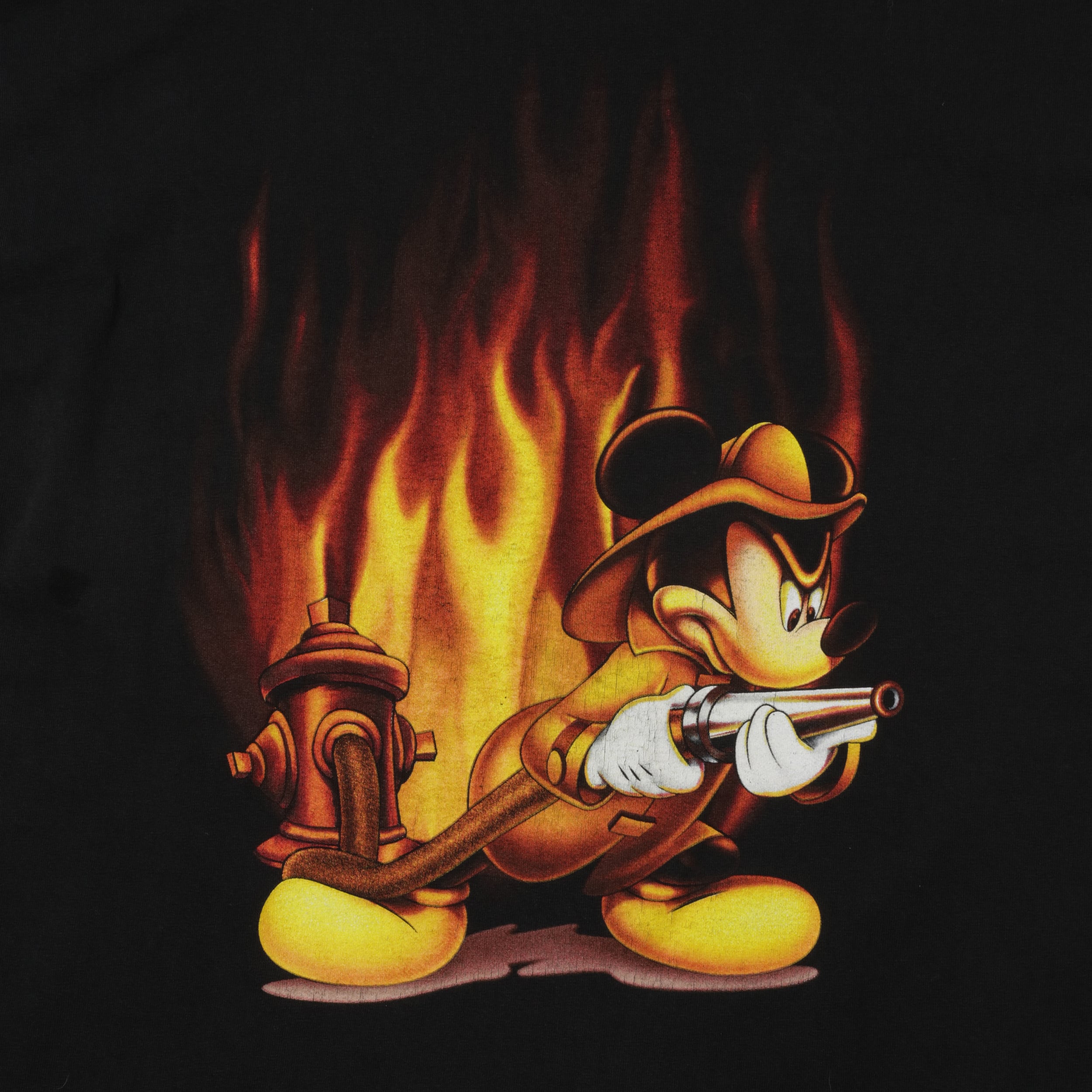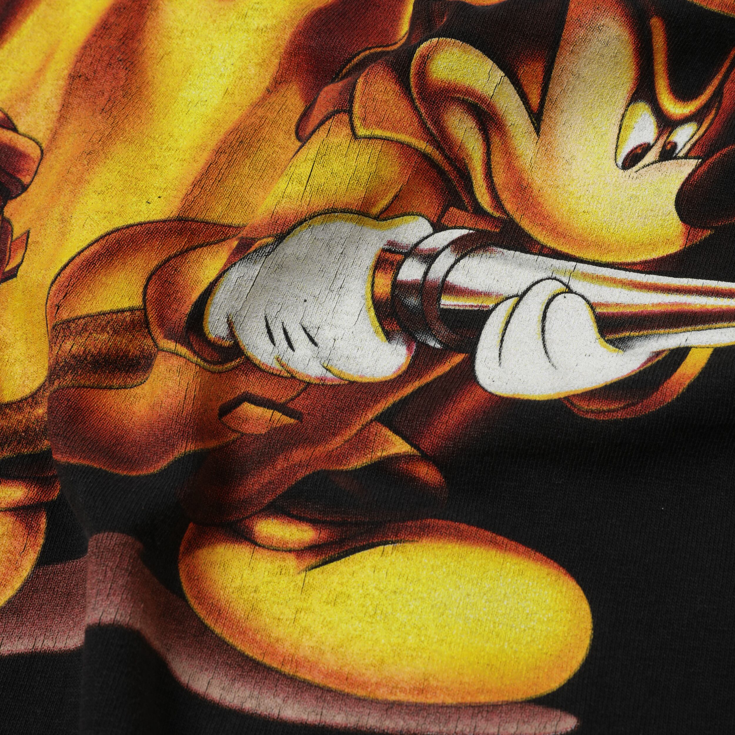 フロントには「Magic Kingdom / Walt Disney World」のロゴプリント、そしてバックには消防士姿のミッキーマウスが放水する迫力のフルプリント。背後の炎グラフィックとのコントラストが圧巻です。